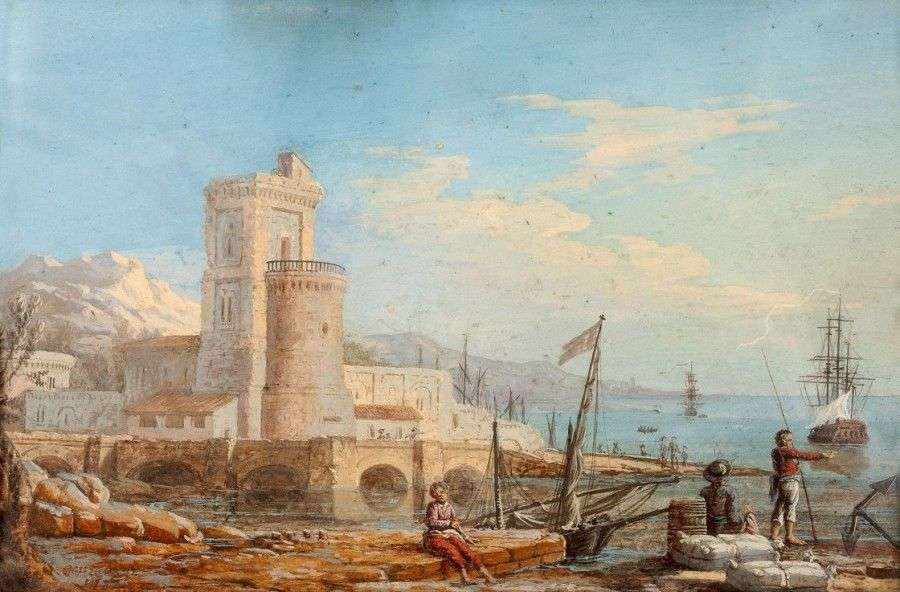 Vue d'un port méditerranéen Gouache Signé et daté en bas à gauche Gonzalez 1782 16,5 x 23,5 cm Peintre et surtout décorateur, Antoine Gonzalès étudia à Bordeaux dans l'atelier du milanais Giovanni Antonio Berinzago. Ils travaillèrent ensuite ensemble jusqu'en 1786, notamment aux importants décors en perspective du Palais de la Bourse aujourd'hui disparus. Gonzalès appartint à l'Académie de Bordeaux. Il fut aussi décorateur ordinaire du Théâtre, et laissa des paysages, vues de ruines romaines, à la gouache.