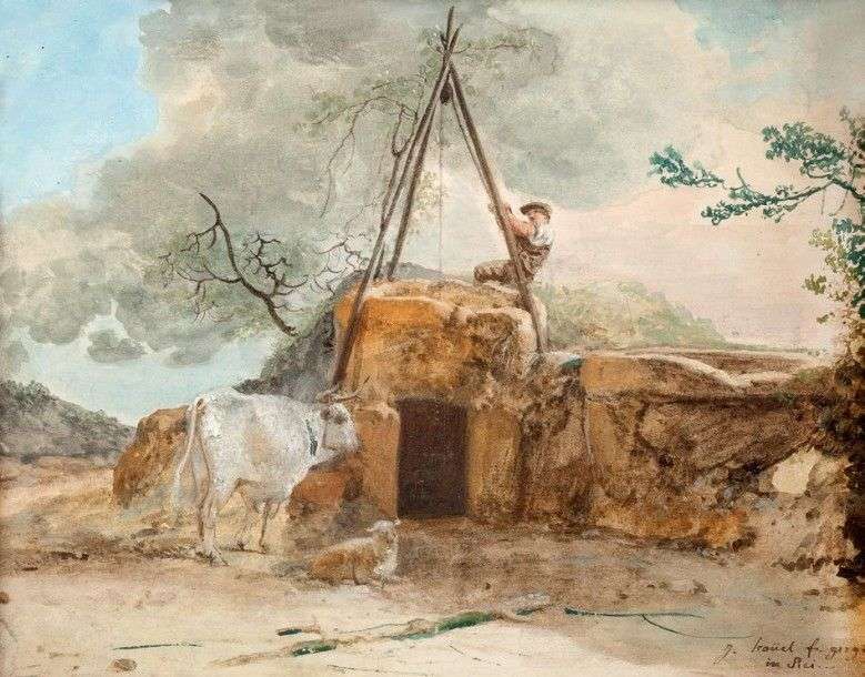 Berger au puit et son troupeau Gouache et aquarelle Signée en bas à droite J.Houel f Girge in Sici.... 18.5 x 23.5 cm