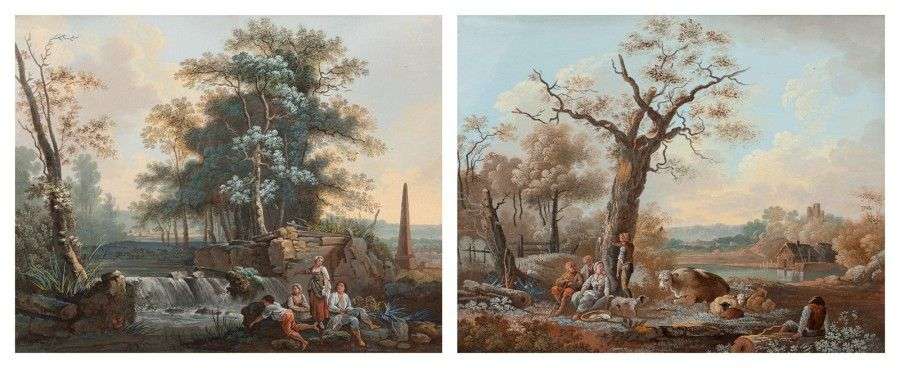 Scène animée près d'un torrent Les Bergers Paire de gouache et aquarelle A vue 27 x 35 cm