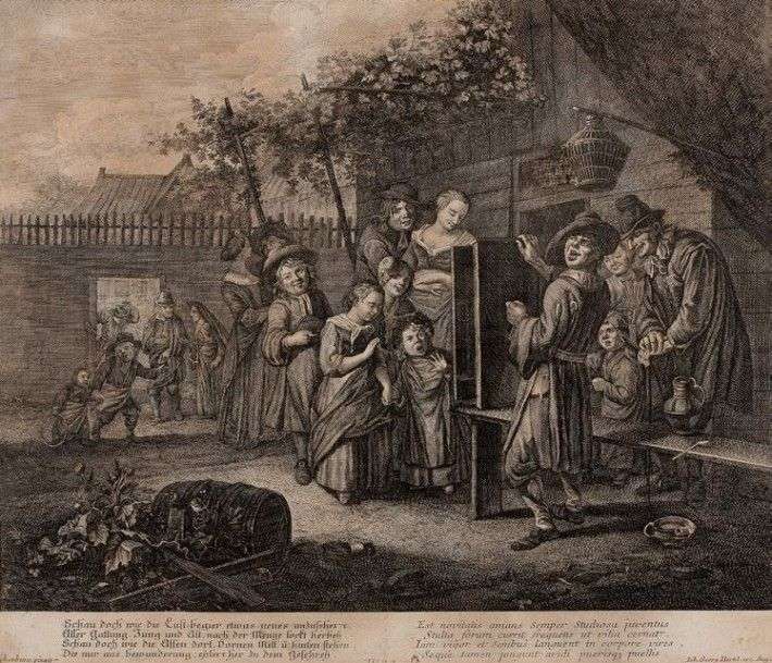 Gravure noir et blanc par Georges Hertel Scène familiale devant l'auberge