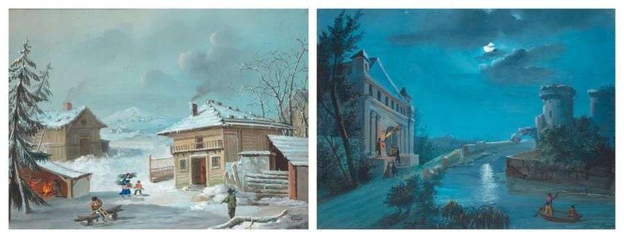 Paysage d'hiver Paysage au clair de lune Paire de gouaches sous verre 41 x 56 cm