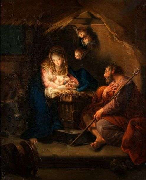 La Nativité Sur sa toile d'origine 57,5 x 45,5 cm Reprise de la toile (55 x 43 cm) de Pompeo Batoni conservée au Palazzo Corsini à Rome (voir A. M. Clark, Pompeo Batoni. A Complete Catalogue of his Works with an Introductory Texte, Oxford, 1985, n° 120, reproduit fig. 115). (*)