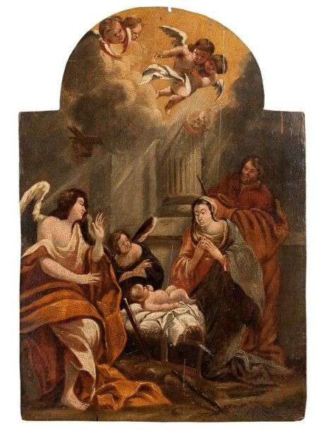 L'Adoration de l'Enfant Panneau de chêne, cintré 53 x 36,5 cm Sans cadre.