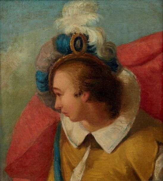 Portrait d'homme au chapeau à plumes Huile sur toile 32 x 28 cm