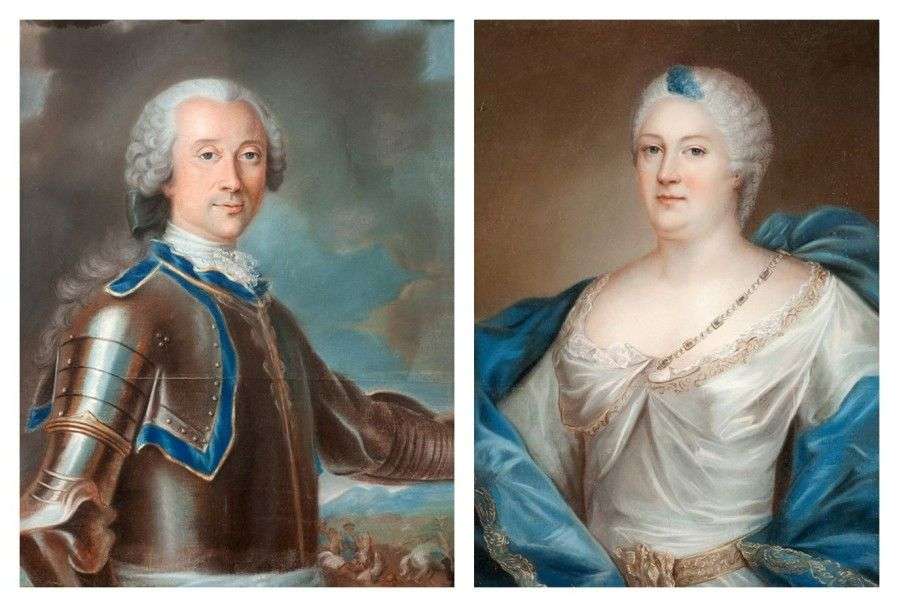Portrait d'homme en armure Portrait de femme à l'étole bleue Pastel A vue 77 x 58 cm Traces d'humidité.