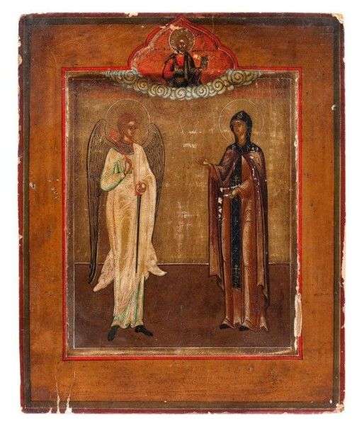 Icône de Sainte Eudoxie et l'archange saint Michel. Russie milieu XIXème siècle. Sainte Eudoxie, riche courtisane célèbre à Héliopolis sous le règne de Trajan se convertit au Christianisme et se retira dans un monastère. Dénoncée elle fut décapitée. Face à elle, tout de blanc vêtu, l'archange protecteur Saint Michel, prince des armées célestes et pourvu d'une épée. Au dessus d'eux dans les nuées, le Seigneur les bénit. 18 x 15 cm Bon état.