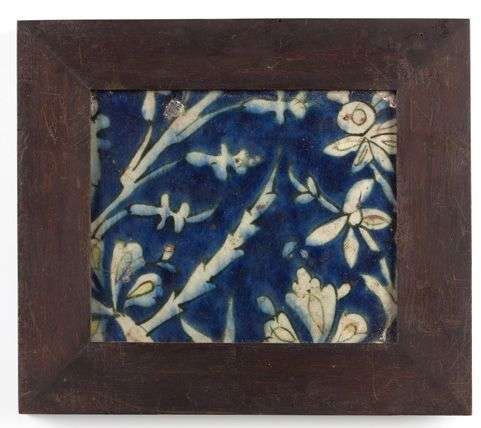 Carreau en céramique siliceuse à fond bleu Décor de palmes et fleurs XVIIème siècle A vue H: 27,58 cm - L: 31,5 cm