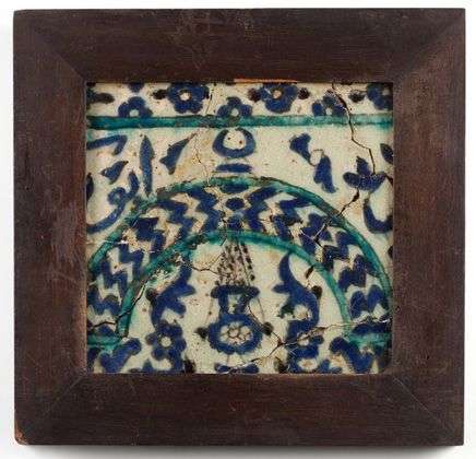 Carreau en céramique siliceuse à décor peint de lampe de mosquée sous dôme XVIIème siècle A vue H: 30 cm - L: 31,5 cm Accidents.