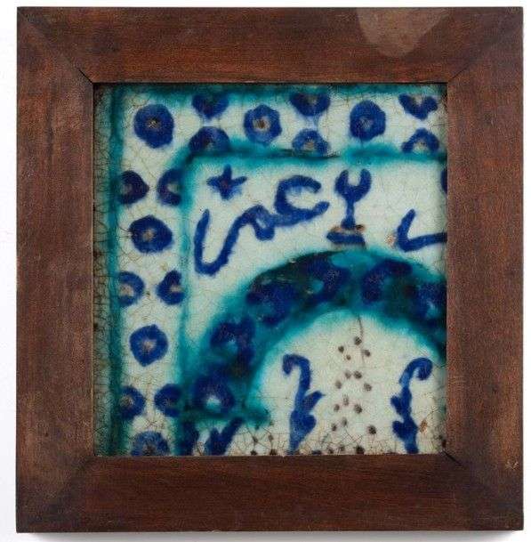 Carreau en céramique siliceuse à décor peint de cobalte et turquoise Entrée de mosquée avec croissant XVIIème siècle A vue H: 30,5 cm - L: 29,5 cm Craquelures.