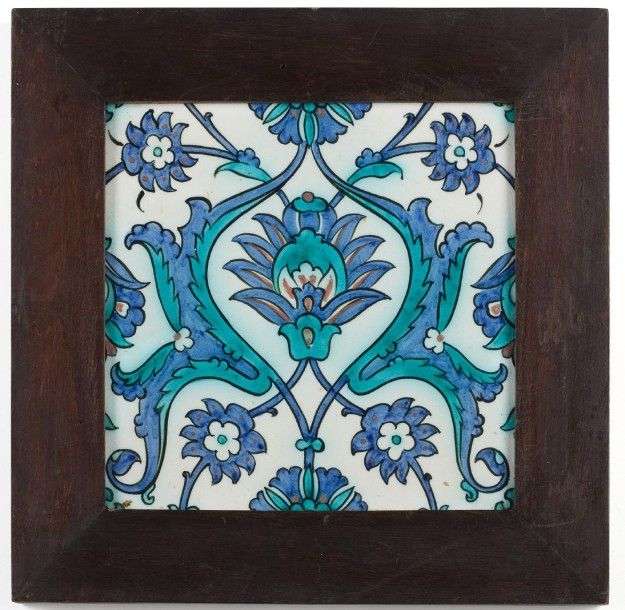 Carreau en céramique siliceuse à décor peint de mandorles et fleurs XVIIème siècle A vue H: 31,5 cm - L: 31,5 cm