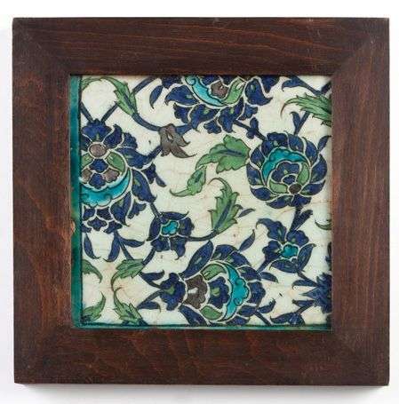 Carreau en céramique siliceuse à décor peint de fleurs stylisées XVIIème siècle A vue H: 31 cm - L: 31 cm.
