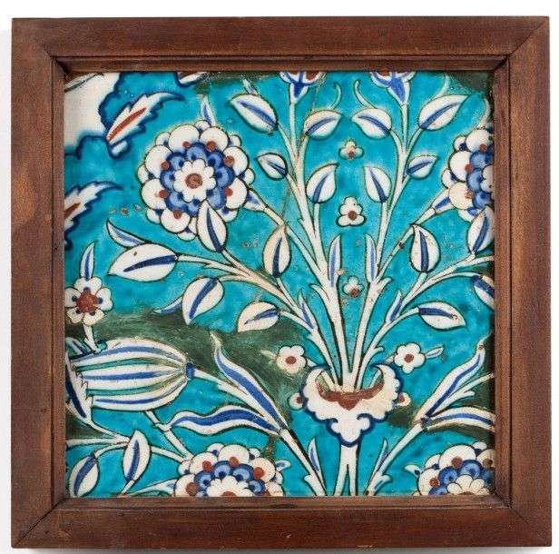 Carreau en céramique siliceuse à fond bleu turquoise Décor d'oeillets et de tulipes Fin XVIème siècle A vue H: 29 cm - L: 29 cm Restauration et accidents.