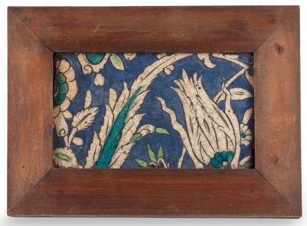 Carreau en céramique siliceuse à décor peint de palmes et tulipes XVIIème siècle A vue H: 22,5 cm - L: 32 cm