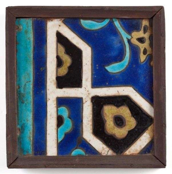 Carreau en céramique siliceuse à décor peint géométrique et floral XVIIème siècle A vue H: 21 cm - L: 19,5 cm