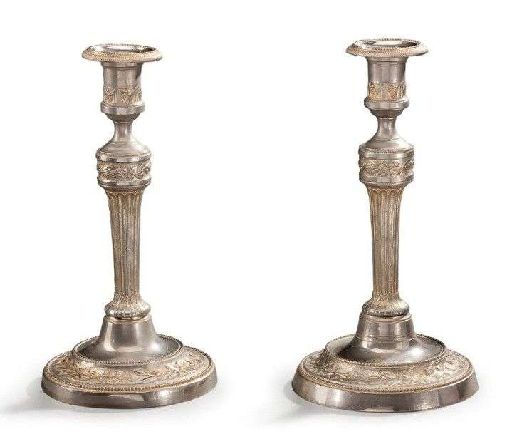 Paire de bougeoirs en métal argenté à décor d'une frise de lierre et laurier Style Louis XVI H: 27.5 cm (*)