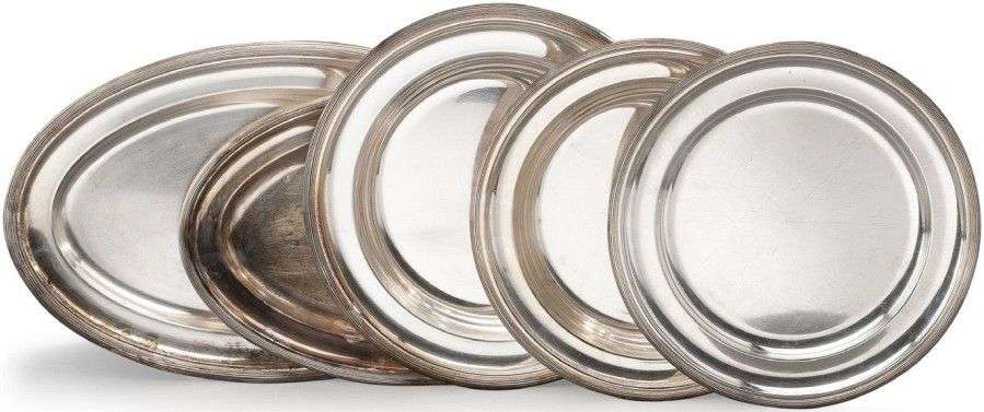 Ensemble de cinq plats à filets en métal argenté de formes différentes (*)