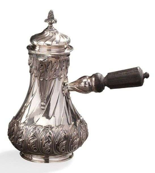 Verseuse égoiste en argent à décor de godrons, tors et feuilles d'acanthes en relief. Manche latéral en ébène. Poinçon Minerve. Orfèvre: Roussel, fin XIXème siècle H: 18 cm Poids: 298,80 g (*)