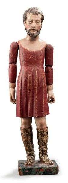 Manequin articulé en bois polychrome vêtu d'une tunique rouge et de bottes à poids XVIIIème siècle H: 59 cm Accidents et manques.