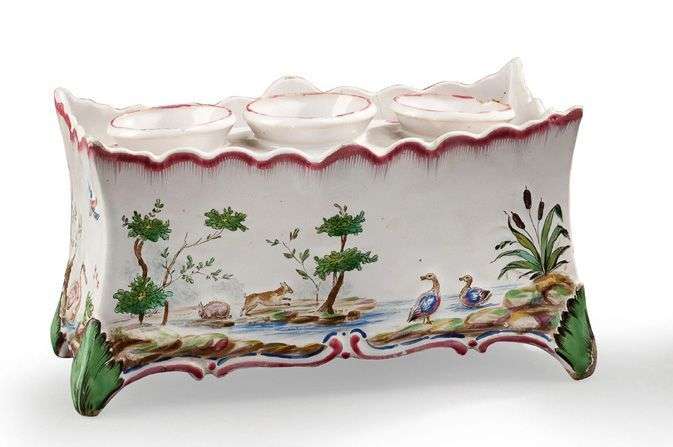 Bouquetière à décor polychrome de scènes champètres, peignés rouges sur le bord. XVIIIème siècle. L: 20 - H: 10.5 cm Fêle.