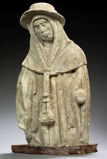 Statuette en pierre calcaire figurant un pèlerin. XVIème - XVIIème siècle. H: 70 - L: 36 cm