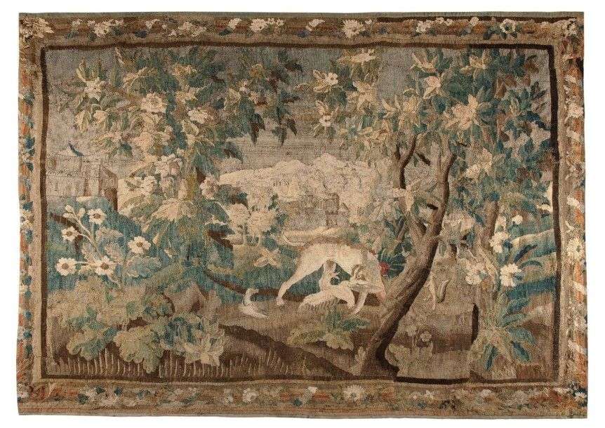 Tapisserie à décor d'un chien de chasse sur fond de verdure et château en perspective Bordures à décor de fleurs 224 x 282 cm Usures et restaurations.