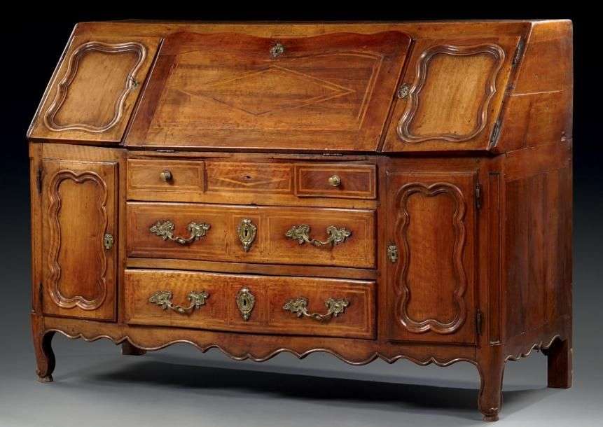 Curieux secrétaire de pente en noyer mouluré| l'abattant encadré de deux petites portes découvre un serre-papier muni de cinq petits tiroirs| la façade formant commode ouvre par deux portes encadrant quatre tiroirs dont deux étroits. Décor incrusté de filets à motifs de losanges. Travail provincial du XVIIIe siècle (restauration d'usage et un pied arrière remplacé). H: 107 - L: 147 - P: 63 cm.
