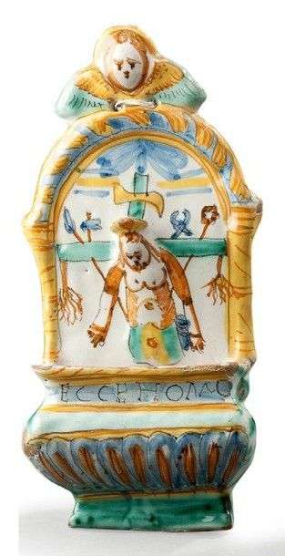 Bénitier à décor polychrome au centre, portant l'inscription "ecce homo", le fronton orné d'un ange, le bassin à godrons XVIIIème siècle H: 25 cm Éclats et fêle.