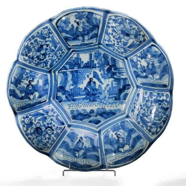 Plat rond creux à décor en camaieu bleu de scènes chinoises et rinceaux feuillagés XVIIIème siècle Fêle