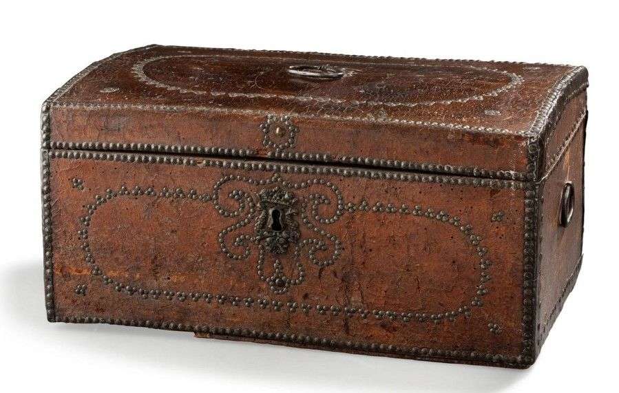 Coffret à âme de bois Gainée de cuir à décor de clous disposés en rinceaux stylisés| il ouvre par un couvercle légèrement bombé découvrant un intérieur anciennement gainé. Fin du XVIIème ou début du XVIIIème siècle. H: 25 - L: 50 - P: 34 cm Altérations.