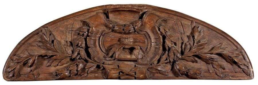 Elément de boiserie En chêne sculpté représentant, dans un cartouche, une table supportant un manteau et une couronne (rapportée) dans un environnement de branches et chutes de laurier. XVIIIème siècle. H: 43 - L: 132 cm Gerces.