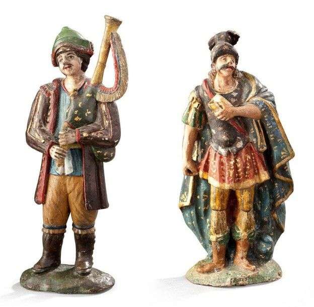 Deux statuettes en terre cuite polychrome et dorée Elles représentent un guerrier casqué et un joueur de cornemuse| sur des terrasses stylisées. Travail portuguais du XVIIIème siècle H moyenne: 22 cm Restaurations.