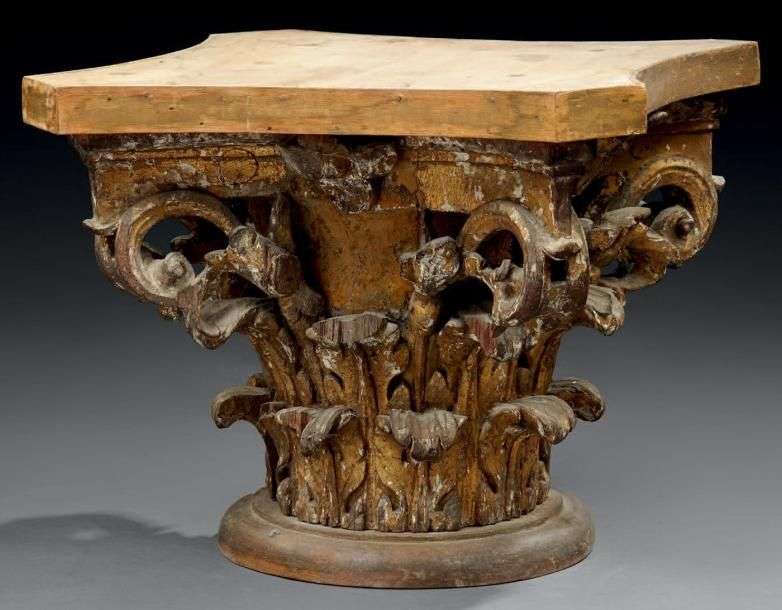 Chapiteau corinthien En chêne sculpté et doré. Fin du XVIIème ou début du XVIIIème siècle. H: 34 cm Éclats et manques.