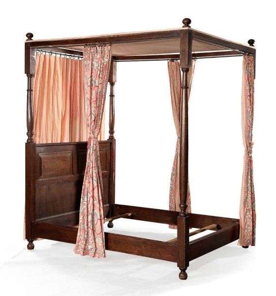 Lit à baldaquin en chêne naturel tourné ou mouluré| la tête à panneaux à platebandes. H: 235,5 - L: 207 - P: 167 cm. (**)