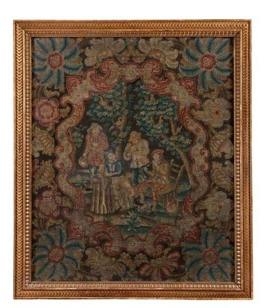 Panneau en tapisserie aux points à décor d'une scène de village d'après Téniers à réserve d'entourage de crosses et feuillages sur fond de larges fleurs. Fin du XVIIème ou début du XVIIIème siècle. Dans un cadre en bois sculpté et doré de style Louis XVI à frises de piastres et raies de c?ur. H: 92 - L: 77,5 cm Usures.