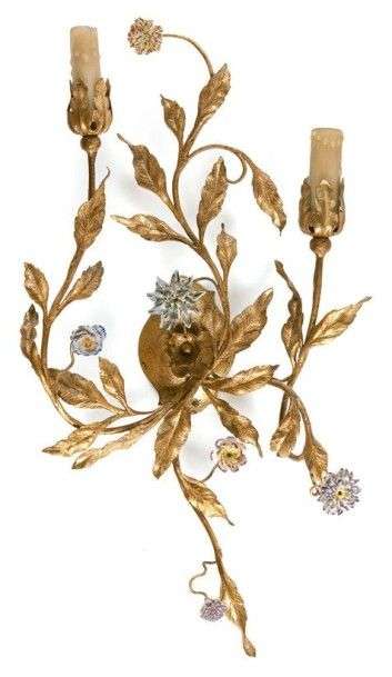 Applique à deux lumières En métal repoussé et doré| la platine et les bras sous forme de branchages feuillagés agrémentés de fleurettes en porcelaine polychrome. H: 54 cm Quelques fleurettes accidentées.(*)