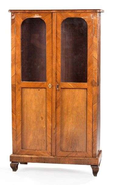 Armoire basse En placage d'amarante marqueté en feuilles. Elle ouvre par deux portes dissimulant des rayonnages. Montants plats. Petits pieds cambrés. Premier tiers du XVIIIème siècle. H: 150,5 - L: 84 - P: 38,5 cm Restaurations.