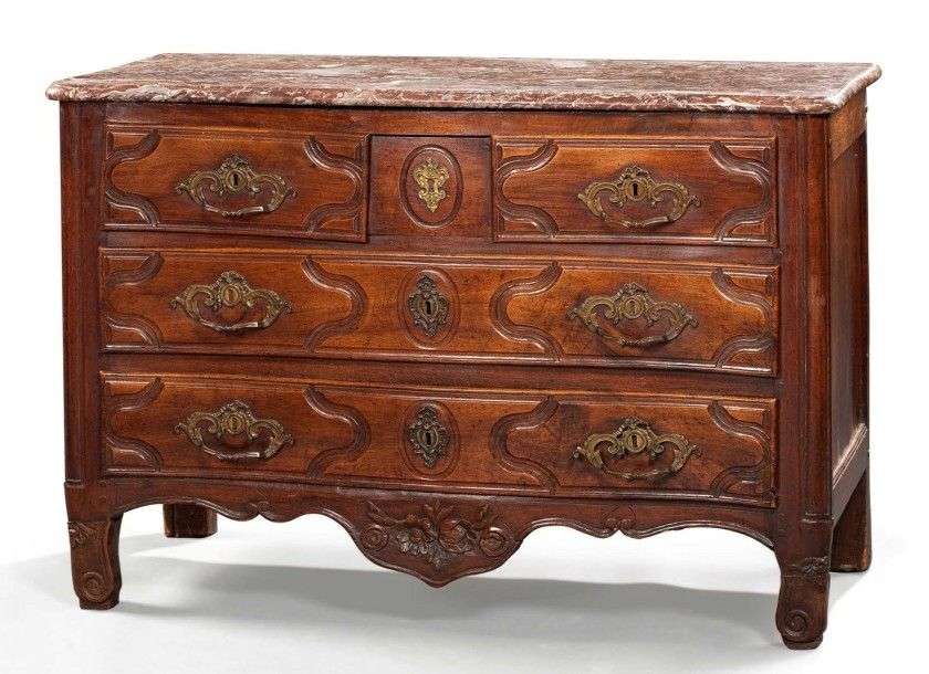 Commode En noyer mouluré et sculpté| de forme légèrement galbée, elle ouvre par quatre tiroirs sur trois rangs| tablier chantourné et agrémenté d'un bouquet de fleurs| montants arrondis et pieds à enroulements. XVIIIème siècle. Plateau de marbre brèche rouge. H: 80 - L: 120 - P: 55 cm. Pieds entés| modifiée pour recevoir un marbre.