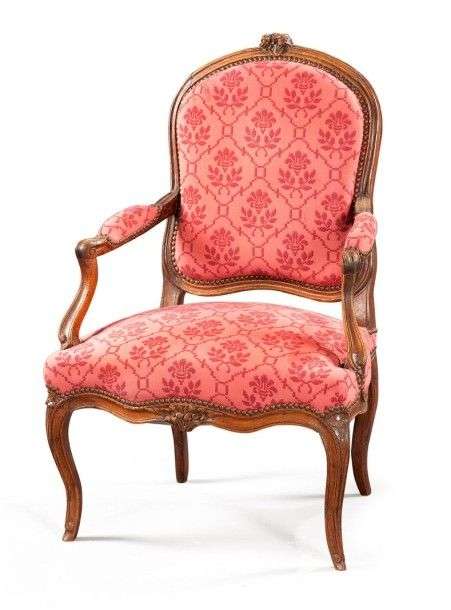 Fauteuil en bois naturel mouluré et sculpté de fleurettes Bras et pieds cambrés Epoque Louis XV Garniture de velours frappé rose