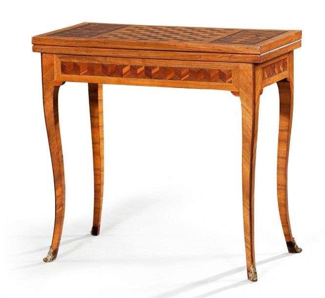 Table à jeux marquetée de bâtons brisés en amarante, bois tabac et prunier dans des encadrements de frisage de noyer. Le plateau déployant comporte un damier et à l'intérieur est tendu de drap rouge. Pieds cambrés. Travail de l'Est de la France de la seconde moitié du XVIIIe siècle (restauration d'usage et légère fente). H: 74,5 cm| L: 78 cm - P: 40 cm.