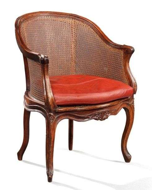 Fauteuil de bureau en noyer mouluré et sculpté| le dossier enveloppant| accotoirs en coup de fouet| traverse avant chantournée à fleurettes et feuillages| pieds cambrés à filets et enroulements. Ancien travail de style Louis XV. H: 78 - L: 51 - P: 50 cm. Deux pieds entés| restauration.