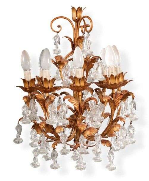 Petit lustre à huit lumières en tôle feuillagée et dorée agrémenté de fleu