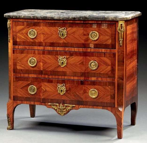 Petite commode marquetée en quartefeuilles de bois de rose dans des encadrements de travers en bois de violette| montants à pans coupés plaqués de palissandre. Elle ouvre par trois tiroirs avec traverses et repose sur des petits pieds. Travail provincial de la fin du XVIIIème siècle Plateau de marbre gris Sainte-Anne H: 77 - L: 83cm - P: 42,5 cm. Restauration d'usage, plateau fracturé.