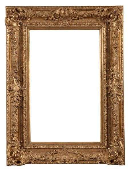 Cadre en bois mouluré et sculpté et stuc doré| écoinçons à coquilles et fleurettes. XIXème siècle. Vue: H: 67,5 - L: 41,5 cm. Ancienne étiquette de «Lebrun doreur 50, rue Saint Lazare».