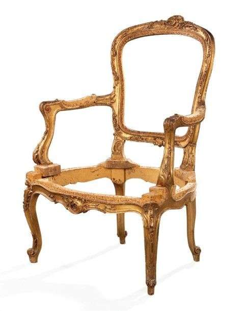 Rare fauteuil à dossier cabriolet en noyer finement sculpté et doré à déco
