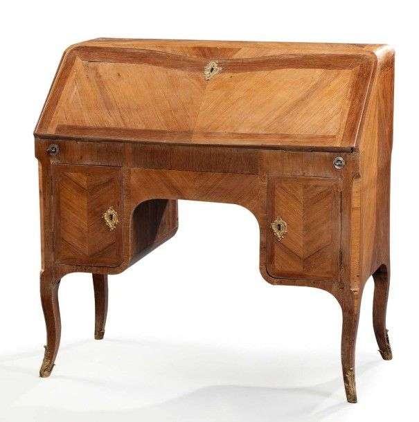 Bureau de pente marqueté en frisage d'amarante dans des encadrements de fil de la même essence| il ouvre par un abattant découvrant un serre-papier à gradin muni de six tiroirs et comportant un casier, et, en façade, par deux vantaux. Epoque Louis XV. H: 100 - L: 100 - P: 52 cm. Éclats et restaurations.