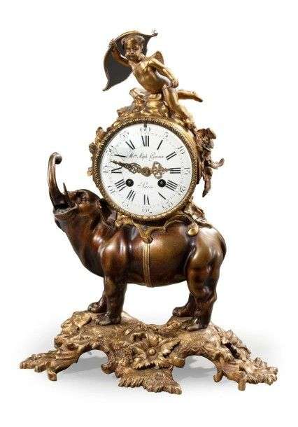 Belle pendule "à l'éléphant" en bronze ciselé et doré, le cadran signé de