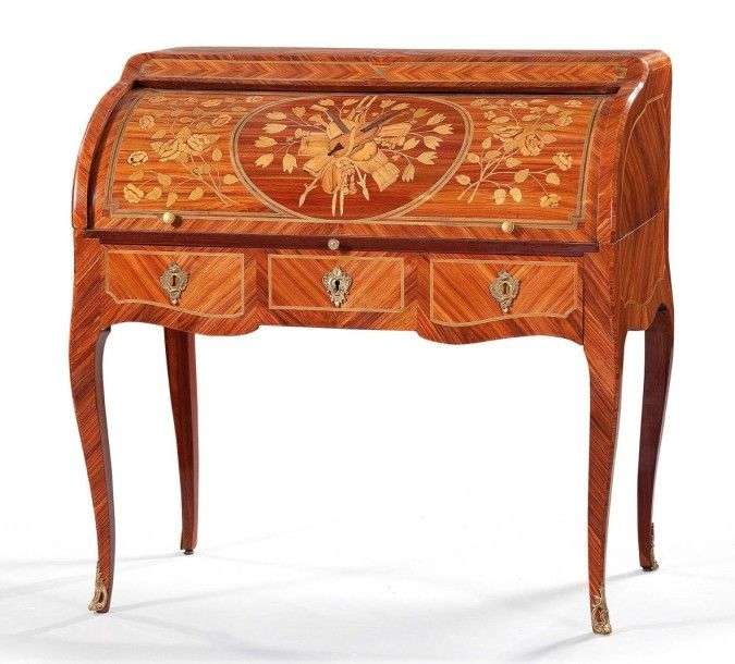 Bureau à cylindre à toutes faces marqueté de bois de rose, bois de violette et bois satiné, dans des encadrements de filets de bois teinté vert| l'abattant, à décor d'un médaillon centré d'attributs de musique et de bouquets fleuris et feuillagés, dissimule quatre tiroirs et un casier et dévoile un plateau coulissant gainé de cuir marron doré aux petits fers| il ouvre par un large tiroir en ceinture| pieds cambrés. Epoque Louis XV. Ornementation de bronze ciselé et doré tels qu'entrées de serrure et sabots. H: 99 - L: 98 - P: 56 cm. Restauration d'usage.