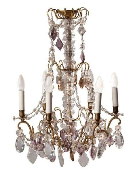 Lustre à six lumières en bronze doré agrémenté de plaquettes, rosaces, perles en chutes et poire facettée en cristal moulé taillé, certains éléments fumés| la tige centrale à fourreau en cristal facetté (monté à l'électricité). Style Louis XV. H: 75 - D: 50 cm. (*)
