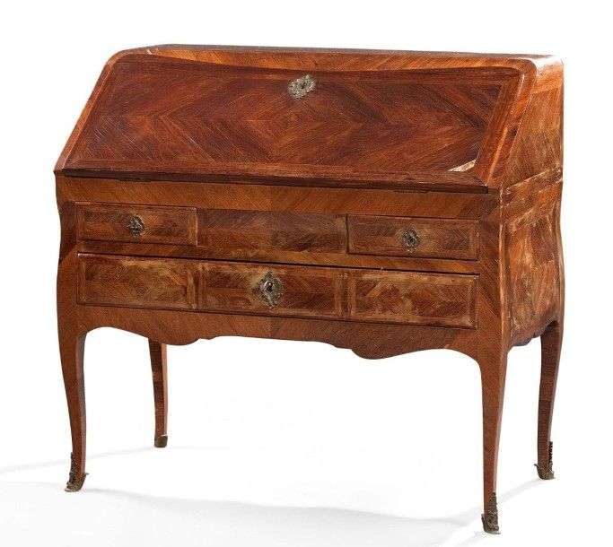 Bureau de pente marqueté à toutes faces en quartefeuilles d'amarante dans des encadrements de fil de la même essence| de forme légèrement sinueuse, il ouvre par un abattant dissimulant un serre-papier muni de six tiroirs et comportant un casier secret et en façade par trois tiroirs, dont un large. Epoque Louis XV. H: 93,5 - L: 97,5 - P: 49 cm. Accidents et manques