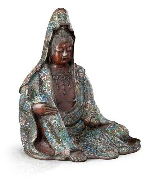 Grande sculpture en bronze à patine brune et bronze cloisonnée représentée assise, la jambe repliée. XIXème siècle H: 50cm (*)